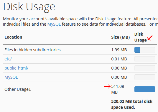 3. From the Disk Space Usage area, you can see which directory is using a lot of space and check the disk usage of MySQL.